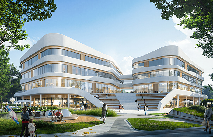 建筑色彩上以高明度、低彩度的暖色与米白为主色调,局部辅以暖灰色。立面采用low-e玻璃、铝板等材料,充分表达建筑的现代感与未来感。